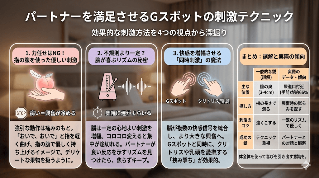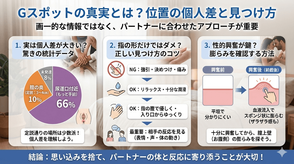 Gスポットに関する情報は巷に溢れていますが、その多くは画一的なものであり、すべての女性に当てはまるわけではありません。ここでは、以下の3つのポイントについて詳しく解説します。
