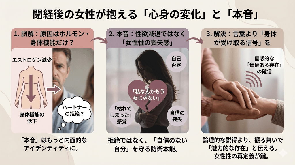 多くの男性が誤解している最大のポイントは、「閉経=性的関心の消滅」という思い込みです。確かにホルモンの影響はありますが、それ以上に女性を苦しめているのは「私なんかもう女じゃない」という強烈な自己否定感です。