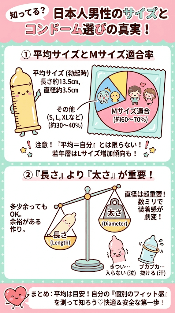 多くの日本人男性が、自分のサイズは平均的であると漠然と考えており、店頭で最も目につくMサイズのコンドームを無意識に選んでいます。実際に、泌尿器科クリニックのデータやコンドームメーカーが行った大規模な調査によると、日本人男性の平均的なペニスのサイズは、勃起時の長さが約13.5cm、直径が約3.5cm程度であるとされています。