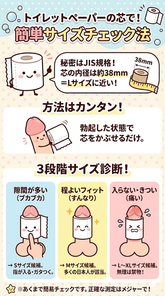 正確な数値を測るためのメジャーが手元にない場合や、購入前にまずは大まかなサイズ感を知っておきたいという場合に非常に役立つのが、どこの家庭にもあるトイレットペーパーの芯を活用した測定方法です。実は、トイレットペーパーの芯の内径は、JIS規格(日本産業規格)によって約38mmと厳密に定められています。この「38mm」という数値は、一般的なLサイズコンドームの直径に近い数値であり、サイズ選びにおける優れた指標となるのです。特別な道具を用意することなく、誰にも知られずに一人でチェックできるため、サイズ選びの入り口として最適な方法と言えます。