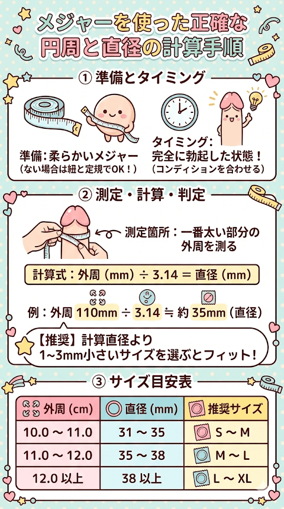 より確実なフィット感を求めるのであれば、感覚的な判断に頼るのではなく、メジャーを使用して数値を計測し、計算によって自分のペニスの直径を割り出す方法が最も確実です。コンドームのパッケージ裏面や公式サイトには直径や幅のスペックが記載されていますが、自分の数値を知らなければ、それらの情報を比較検討することができません。
