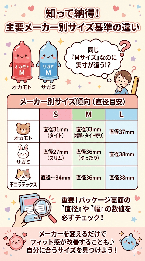 自分の正確なサイズを把握した後に直面するのが、メーカーごとの規格の違いという壁です。洋服や靴のサイズがブランドによって微妙に異なるように、コンドームも「Mサイズ」という共通の表記であっても、メーカーやブランドによって実際の大きさ(直径や形状)は異なります。ここを正しく理解していないと、せっかくメジャーで寸法を測っても、選び間違えてしまう可能性があります。