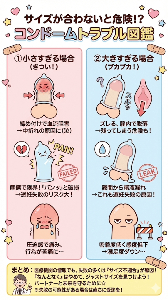 サイズが合っていないコンドームを使用し続けることは、単なる装着時の不快感にとどまらず、避妊の失敗や性感染症のリスクを高める深刻な問題に直結します。