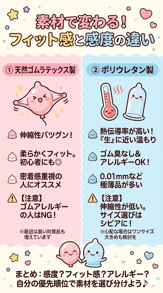 サイズと同じくらい重要なのが、コンドームに使われている「素材」です。現在市場で主流となっている素材は、大きく分けて「天然ゴムラテックス製」と「ポリウレタン製」の2種類があり、それぞれに装着感や特性が大きく異なります。
