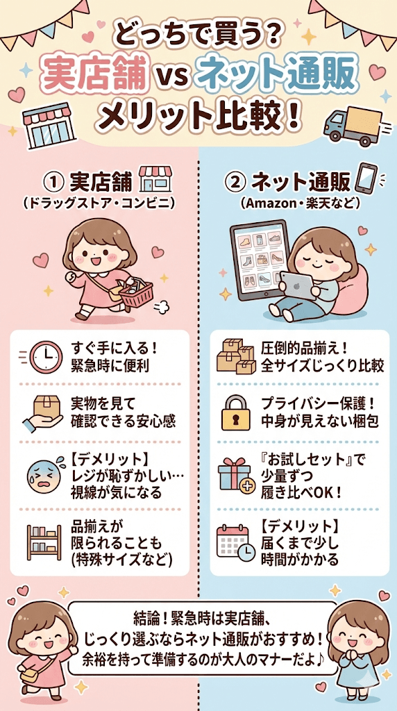 自分に合いそうなサイズや素材の目星がついたら、次はどこで購入するかという問題です。ドラッグストアやコンビニエンスストアなどの実店舗と、Amazonや楽天市場などのネット通販には、それぞれメリットとデメリットがあります。