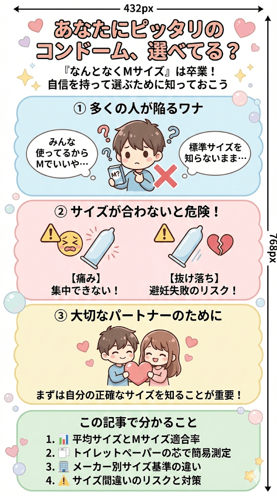ここまで、日本人の平均サイズ、正しい測り方、メーカーや素材による違いについて詳細に解説してきました。自分に合ったコンドームを選ぶことは、単に「きつくない」「抜けない」という物理的な問題を解決するだけでなく、性生活の質を向上させ、パートナーとの信頼関係を深めるために不可欠な要素です。